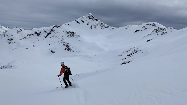 Avanzamos por las vaguadas cargadas de nieve buscando el mejor itinerario hasta alcanzar un collado que nos deja la cima a la izquierda. Hacemos la cresta con crampones y descendemos disfrutando muchísimo con una nieve espectacular dibujando nuestras líneas.