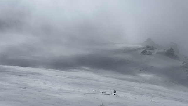 Cerca ya de la cumbre se nos echa encima una niebla muy cerrada y nos bajamos desde la antecima del Konjushka.